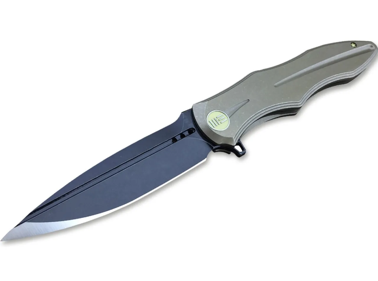 This 613G Model Comes Equipped With A Bronze Titanium Handle And A Black Finished Spear Point Blade. The We Knife Co. 613 Flipper Offers A Large Ergonomic Design, Built To Tackle Your Toughest Cutting Chores. It Has A High Performance Bohler M390 Steel Blade And A Titanium Frame Lock Handle With A Titanium Pocket Clip And Back Spacer. The Handle Is Contoured On The Spine And Belly For Maximized Comfort In Hand. Bronze Anodized Hardware Finishes Off The Appealing Design.