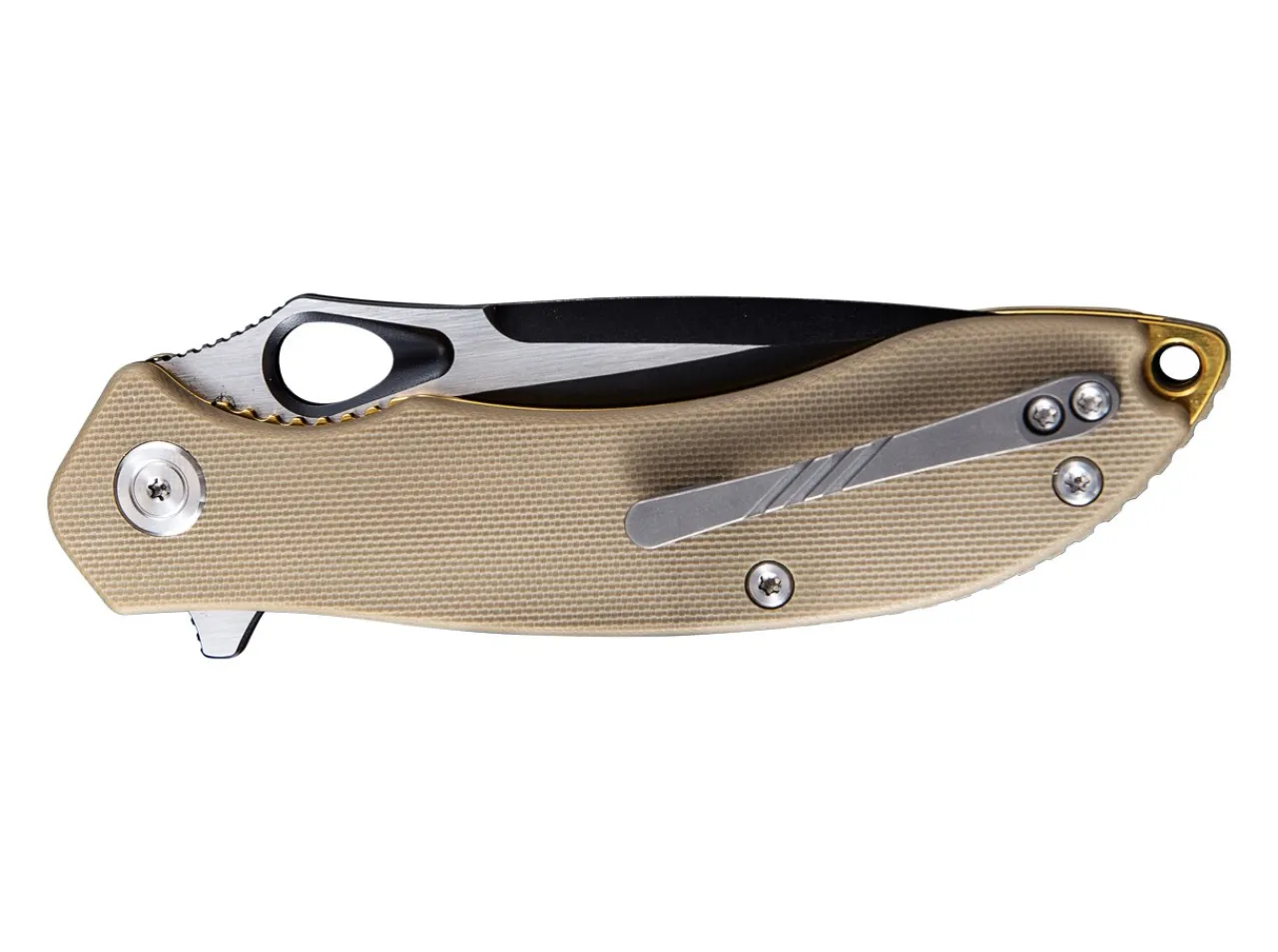 The Aquila Is A High-Quality Linerlock Pocket Knife From We Knife, Who Present A New Line With Civivi, Which Is Distinguished Above All By The Excellent Price-Performance Ratio. Gold-Coloured Tempered Stainless Steel Plates With G10 Scales. Ball Bearing, Partly Coated Blade Made Of Vg-10 With Satin Finish. With Clip (Tip-Up).