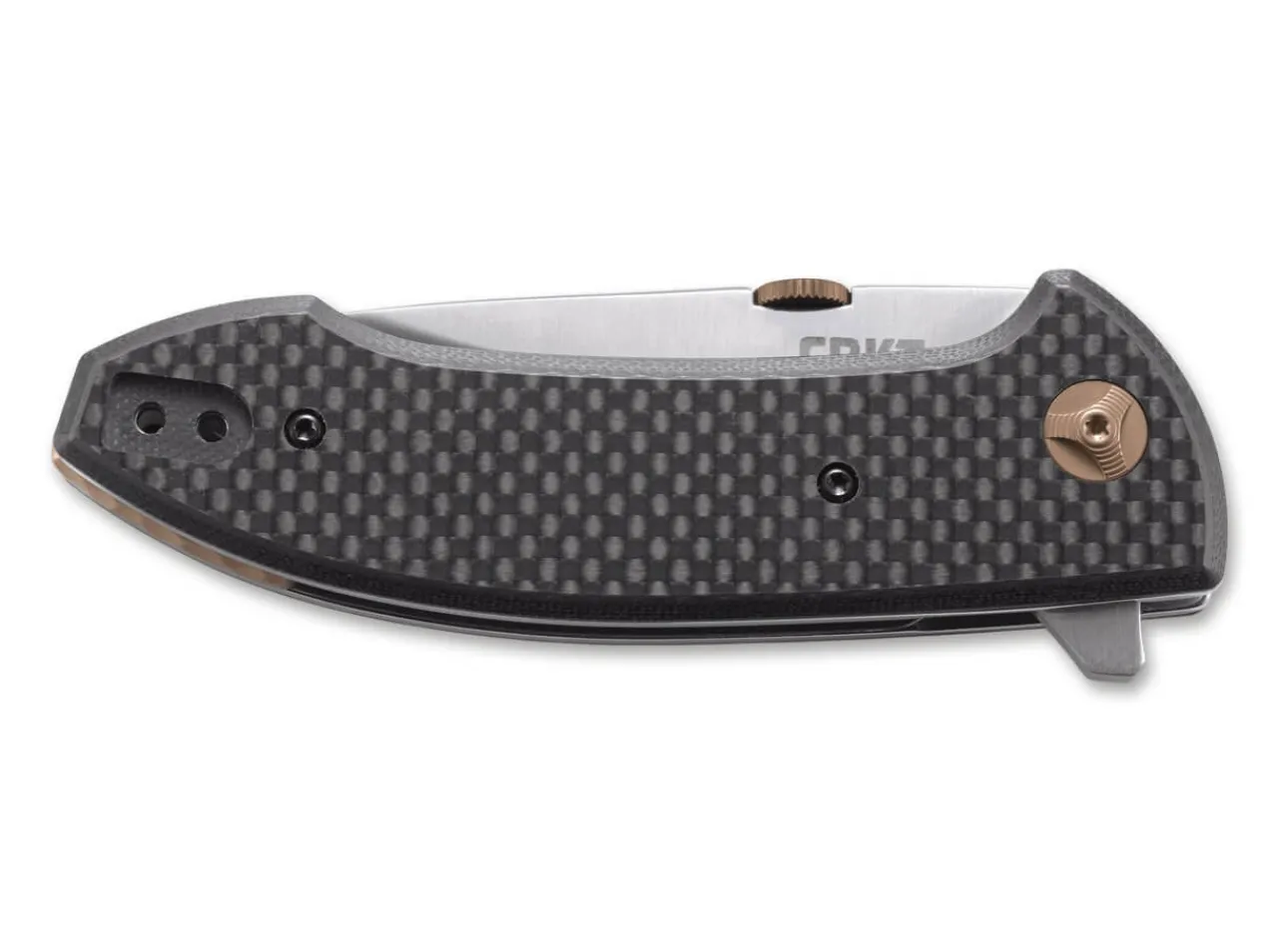 Das Crkt Avant Von Eric Ochs Aus Oregon Ist Wieder Einmal Ein Paradebeispiel Dafur, Wie Gut Ein Minimalistisches Design Ohne Schnorkel Oder Schnickschnack Funktioniert. Der Sanft Gerundete Griff Des Taschenmessers Liegt Ausgezeichnet In Der Hand, Und Die Offnung Der Kugelgelagerten Klinge Per Flipper Oder Daumenscheibe Ist Ebenso Praxisgerecht Wie Der Umsetzbare Clip. Bronzefarbene Akzente Setzen Clip, Klingenlager Und Die Daumenscheibe Und Erzeugen Gemeinsam Mit Der Beschalung Aus Kohlefaser Ein Edles Erscheinungsbild, Das Dennoch Eher Von Understatement Zeugt. Gesichert Wird Die Klinge Durch Einen Linerlock. Mit Umsetzbarem Clip (Tip-Up/L-R).