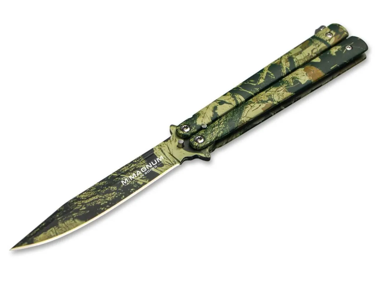 The Magnum Balisong Camo Consists Of Two Handle Scales, Which Can Be Swiveled 180 Degrees. Between These Two Handles The Blade Sits, It Is Attached With An Axle Pin. The Handles, Like The Blade, Are Equipped With A Tactical Camouflage Pattern. This Knife Is A Lightweight And Multi-Purpose Companion With A Wide Range Of Applications In Everyday Life.