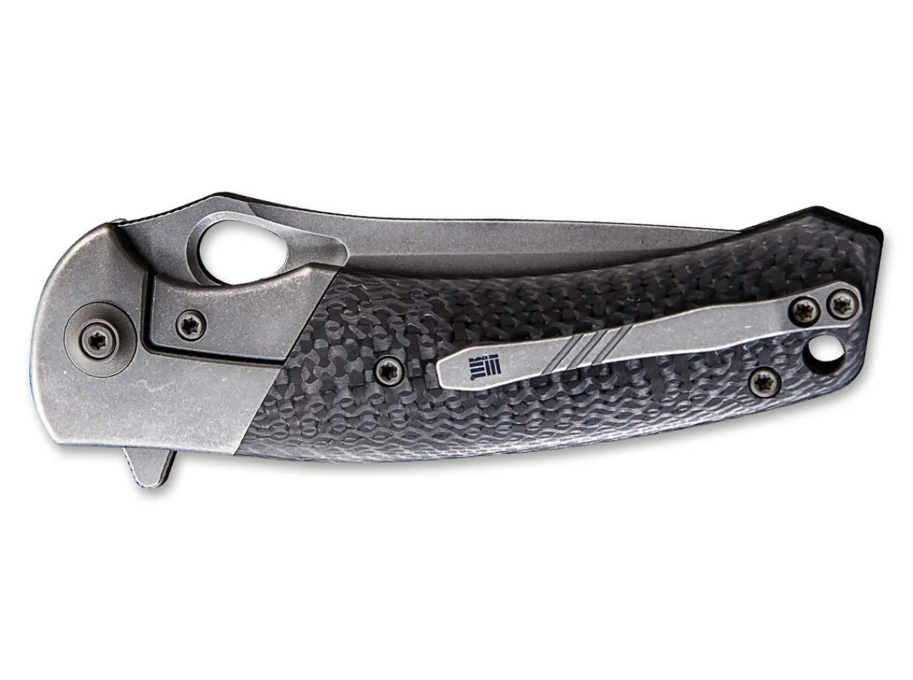 The Bishop Features The Bolster Lock, An Exclusive Framelock Variation. This Lock Is Integrated Into The Bolster Of The Knife, With The Back Part Of The Lock Spring Positioned Under The Handle Scale. Titanium Handle With Carbon Fiber Scales. The Blade On Ball Bearings Consists Of Powder-Metallurgical Bohler M390. The Solid-Milled Clip, Screws, Back Piece And Pivot Cap Also Consist Of Titanium.