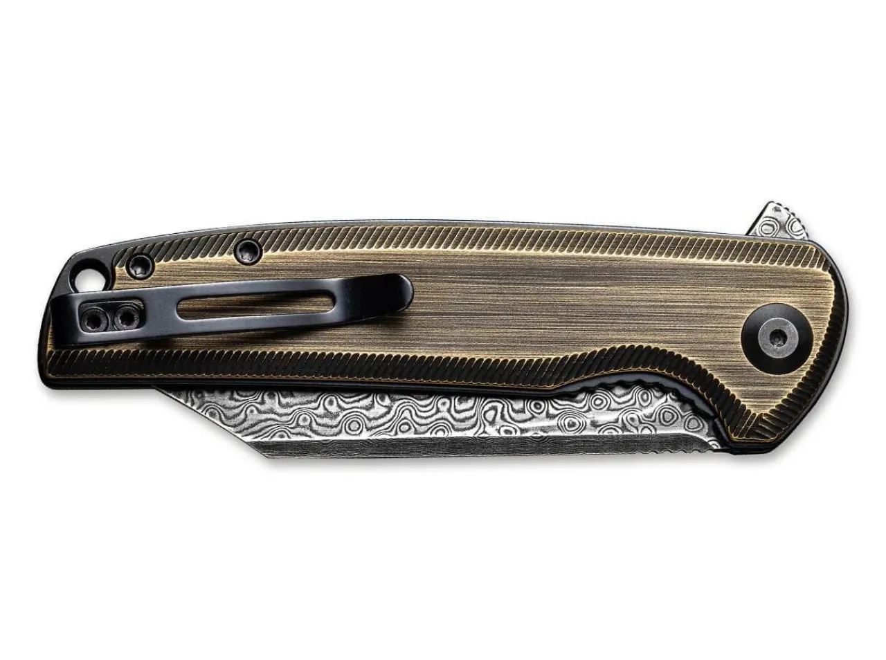 Das Civivi Brigand Damascus Brass Black Besticht Vor Allem Durch Seine Dramatische Wharncliffe Klinge Aus Damast, Welche Per Flipper Geoffnet- Und Von Einem Linerlock Arretiert Wird. Der Griff Aus Messing Ist Hochfest Und Rundet Das Edle Erscheinungsbild Des Edc-Messers Ab. Mit Fangriemenose Und Abnehmbarem Clip (Tip-Up).