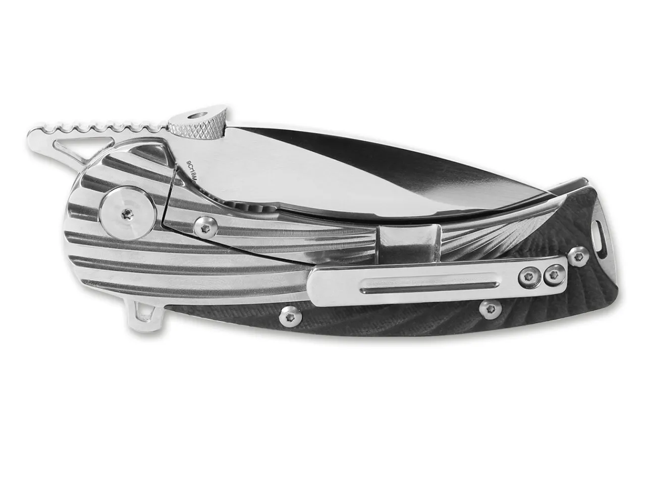 The Spectacular Design Of The Revised Version Of The Krudo Discipline Folder With Its Carbon Fibre Scales Cannot Hide The Fact That This Is A Very Versatile And Potent Cutting Tool. The Pocket Knife Was Strictly Designed According To Krudo’S Maxim Of Maximum Practicality. The Blade Runs On Ceramic Ball Bearings And Opens By Thumb Stud (Which Also Acts As An Opening Hook On The Pocket Hem) And By Front Or Standard Flipper. The Large Clanyard Hole Forms The Grip Closure. Convertible Clip (Tipup/ L-R).