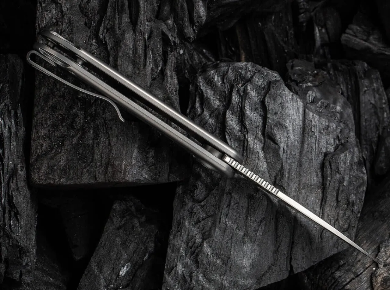 Das Elementum Von We Knife Ist Die Reinform Eines Edlen Framelock Folders. Die Pulvermetallurgische Cpm-20Cv Klinge Und Der Silberne Titangriff Bilden Eine Unzertrennliche Einheit, Die Nur Bei Betatigen Der Flipper-Offnung Und Des Stabilen Framelocks Ihren Aggregatszustand Andert. Doch Aufgepasst: Das Elegante Messer MitClip (Tip-Up/R) Lost Eine Ungeahnte Reaktion Der Begierde Beim Betrachter Aus.