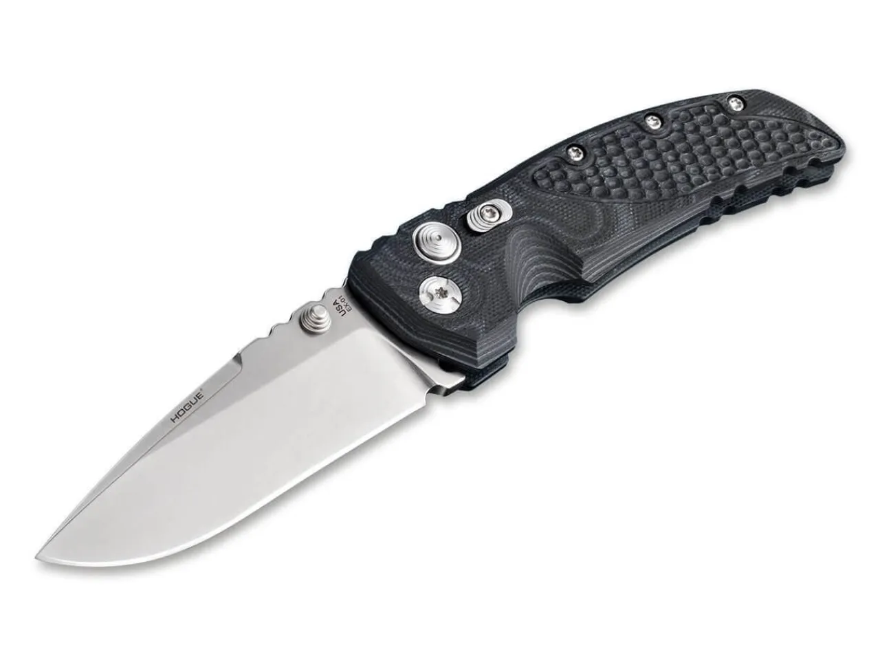 Das Hogue Ex-01 Als Gebrauchsmesser Fur Alltag Und Einsatz Ist Mit Einem Soliden Griff Mit Rutschfester Struktur Ausgestattet. Ausgestattet Ist Das Taschenmesser Mit Einem Pushbutton-Lock Mit Zusatzlicher Schiebesicherung, Der Die Klinge Aus 154Cm Absolut Sicher Verriegelt. Umsetzbarer Clip (Tip-Up/Tip-Down). Der Griff Besteht Aus Schwarzem G-Mascus, Einem Mehrlagigen G10 Mit Damastartiger Struktur.