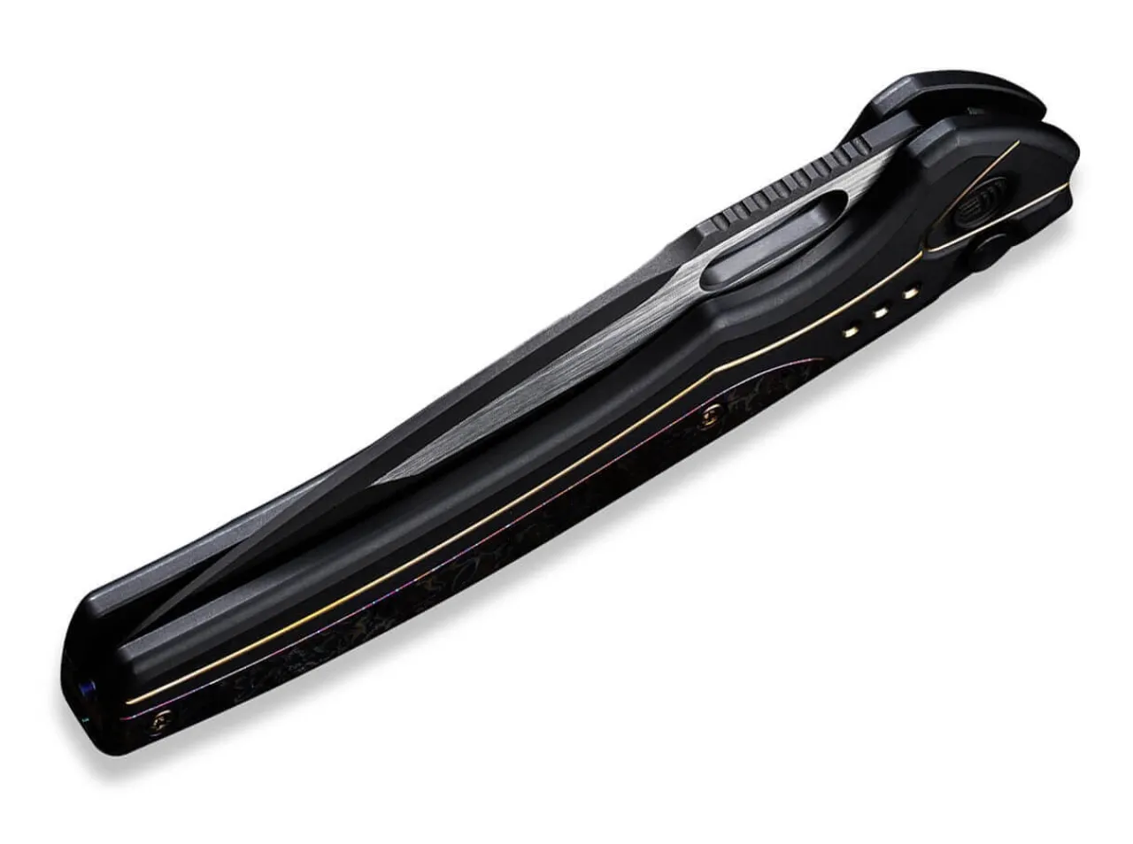 The We Knife Exciton Promises An Elemental Stimulation Of A Special Kind. It Is Not Least The Noble Choice Of Material Of The Model, Strictly Limited To 210 Copies Worldwide, That Provokes A Chemical Reaction Among Knife Enthusiasts. The Ball-Bearing Blade Made Of Powder Metallurgy Cpm-20Cv With A Two-Tone Finish Opens Sensitively Either By Flipper Or Thumb Hole, While The Button Lock Allows Easy Unlocking Of The Pocket Knife. The Exceptional Black Titanium Handle Features An Element Of Iridescent Flamed Titanium And Gold Accents, Releasing An Additional Elemental Charge In The Reward Center. With Deep Carry Clip (Tip-Up/R).