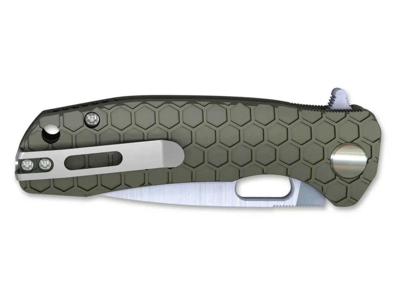 What Is Particularly Impressive About The Honey Badger Flipper Large Is Its Durable Construction. The 8Cr13Mov Drop Point Blade Is Extremely Robust And Easy To Sharpen. The Thick Shaft And Wide Profile With Full Flat Grind Provides Stability And Makes Cutting Easy. The High-Quality Ball Bearing Pivot Enables Smooth Opening And Closing Of The Satin-Finish Blade, Either With The Flipper Or Thumb Opening. The Honeycomb Pattern On The Textured, Olive Green Frn Handle Scales Ensure A Secure Grip. With Lanyard Hole And Reversible Deep-Carry Clip (Tip-Up/L-R).