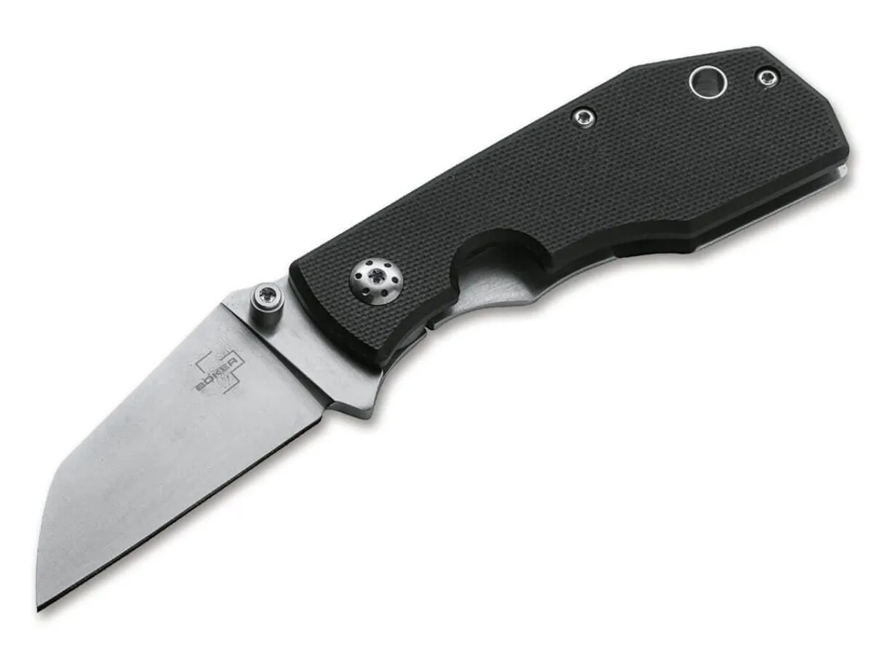 Boker Plus Joule, Designed By Michael Reinhold, Is A Handy Framelock Pocket Knife With Wharncliffe Blade, Which Is Ideal As A Box Cutter And For Other Small To Medium Cutting Jobs. The Satin-Finished Blade Is Made Of D2 And Is Opened By A Removable Thumb Pin On Both Sides. While The Rear Stainless Steel Handle Scales Houses The Framelock, The Front Handle Scales And Spacer Are Made Of Sturdy G10. The Decorative Blade Axle Screw Is Clearly Curved. With Reinforced Lanyard Hole, Deep Carry Clip (Tip-Up/R) And High-Quality Nylon Case For Storage.