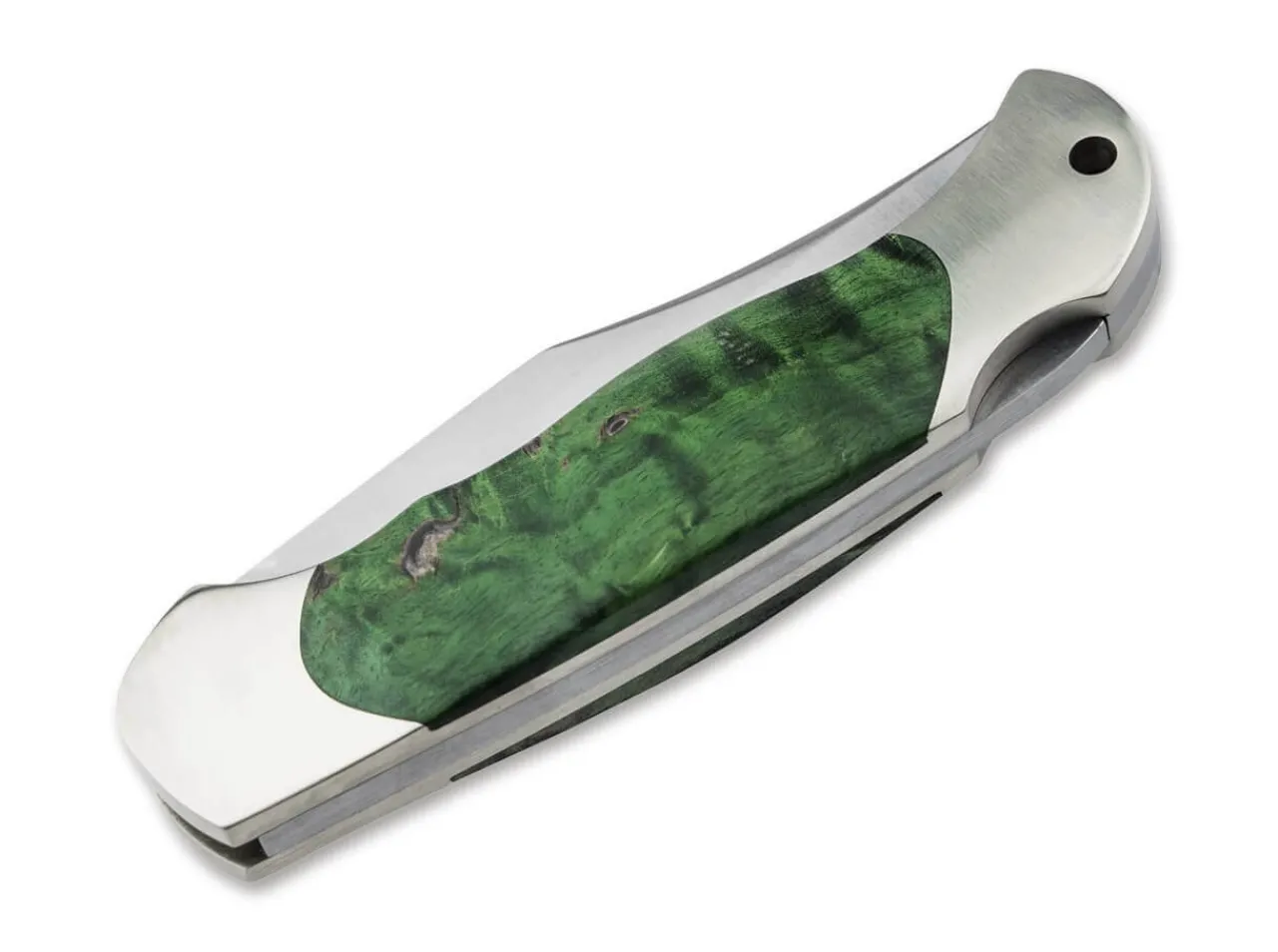 The Saber-Knife Blade Emphasizes The Classic Character Of The Pocket Knife Without Being Obtrusive Or Even Aggressive In Appearance. It Is Made Of Ice-Hardened N690 With 60 To 61 Hrc And Locked By A Sturdy Backlock. With Catch Strap Eyelet And Elegant Scales Made Of Green Stabilized Burl Birch Wood. Handmade In The Boker Knife Manufactory Solingen.