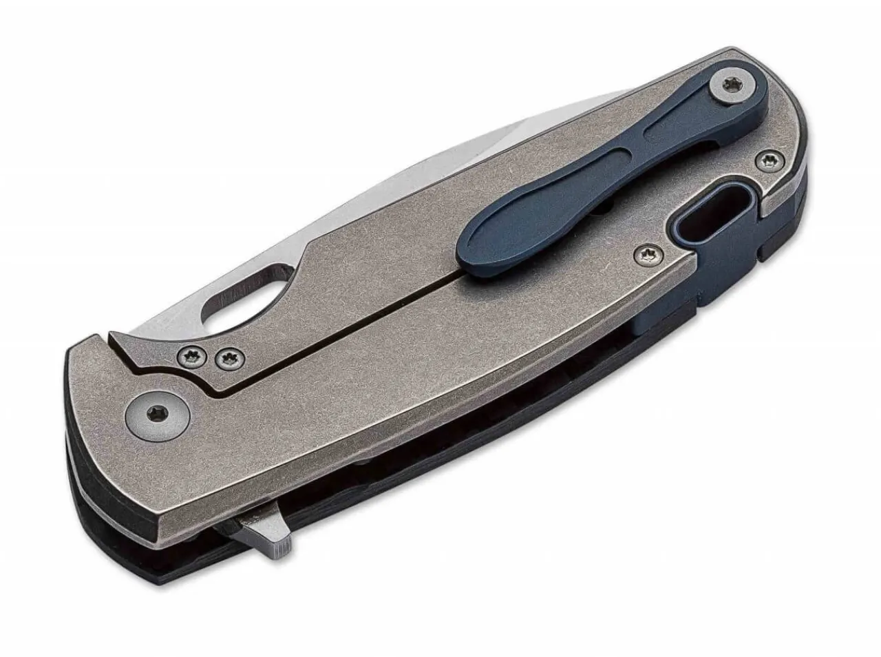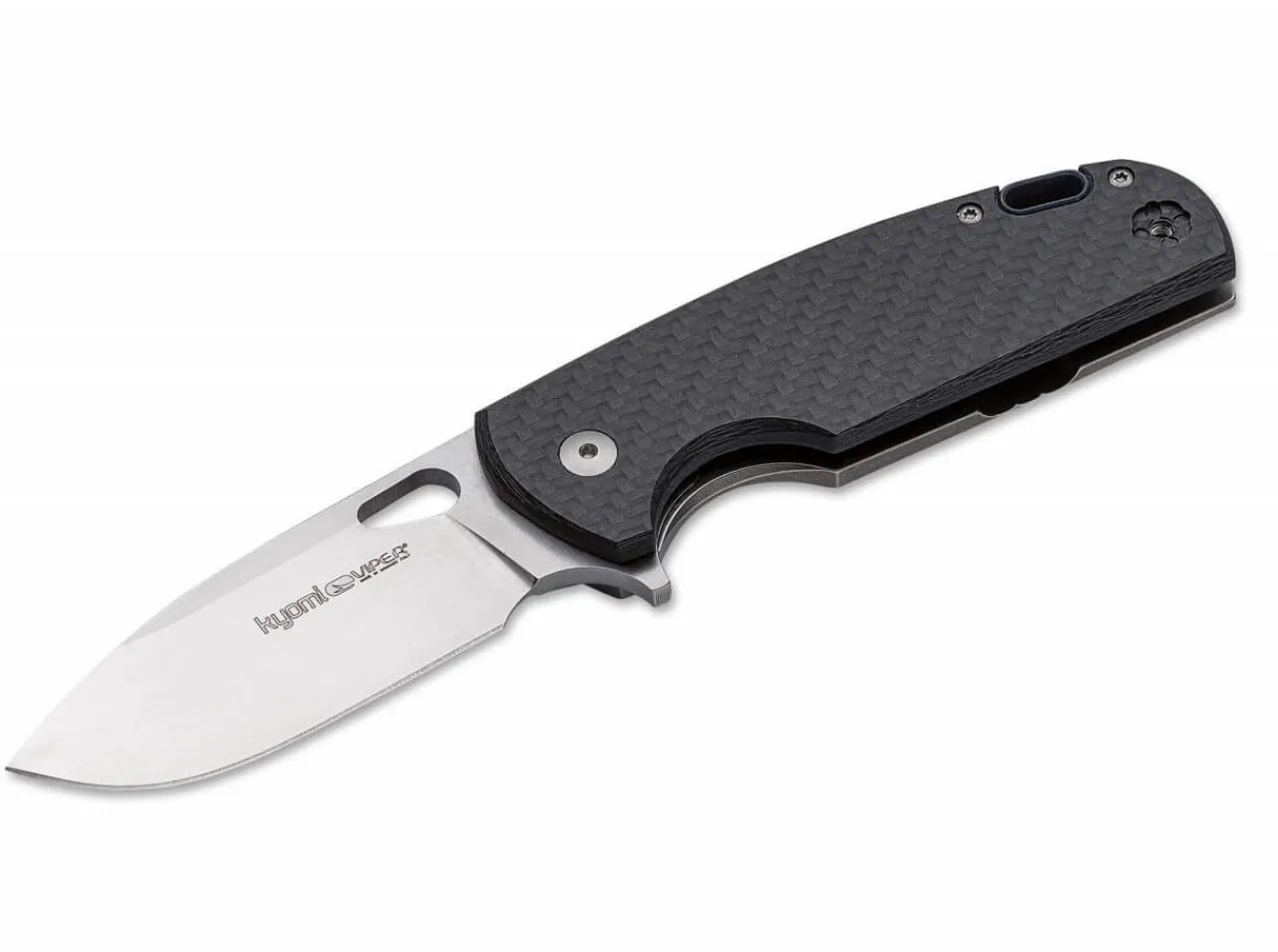 The Kyomi From Jesper Voxnaes Is The Latest Addition To The Cross-Branded Family Of His Folder Designs. On The Kyomi Pate, His Unmistakable Mark Is Evident On The Compact, But Nevertheless Stout Size Of The Knife For Everyday Carry, Outdoor Or Tactical Uses. While The Front Scale Is Configured In Various Versions, The Back Scale Supports The Titanium Frame Lock With Integrated Steel Front Element And The Titanium Clip (Milled From A Solid Blank/Reversible L/R). The Liner Is Also Fabricated From Titanium And Also Houses The Integrated Lanyard Hole That Extends Over The Entire Handle Width. The N690 Blade Is Ball Bearing Supported And Is Deployed With The Flipper Or The Thumb Hole. Satin-Finished Blade And Carbon Fiber Front Scale. The Clip And Wide Lanyard Hole Are Blue-Anodized.