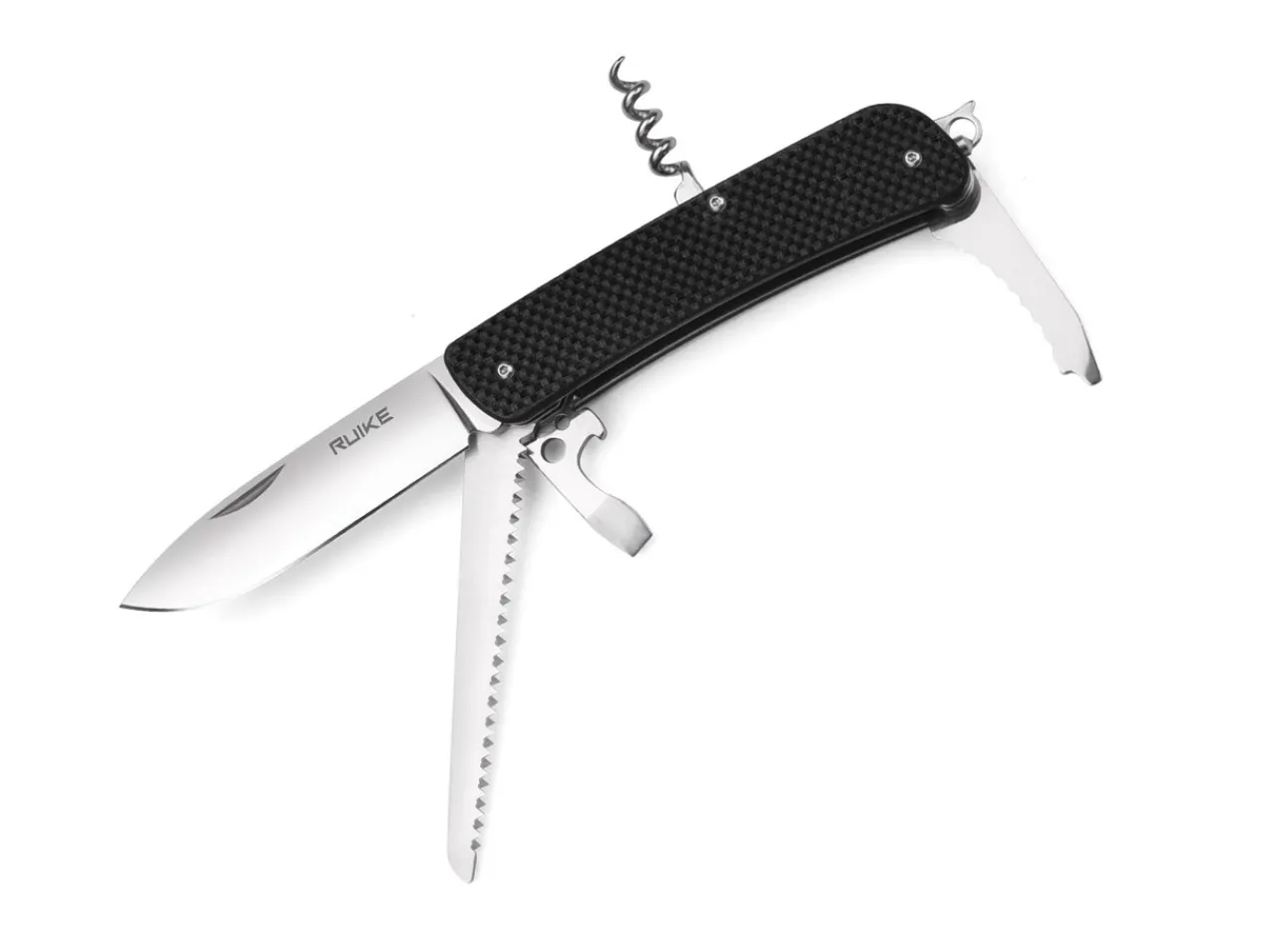 The Large Blade And Robust Tools Make The Ruike L Series Suitable For All Kinds Of Outdoor Activities And Emergency Use. The 8.5 Cm Long Polished Blade Made From Sandvik 12C27 Stainless Steel Has Enhanced Thickness And Width For Longer Life And More Versatile Use. The Textured, Black G10 Handle Sits Comfortably In The Hand For A Secure Grip And Is Ideal For Long-Term Use. It Also Has A Corkscrew, Screwdriver, Bottle Opener, Wire Stripper, Small Screwdriver, Wire Bender, Cutting Hook, Tweezers, And Saw. The Tungsten Steel Glass Breaker Enables The User To Break Glass Or Other Tough Materials. The Knife Opens With A Nail Nick And Is Secured With The Help Of A Slipjoint. With Loop, Key Ring And Tip-Down Clip.