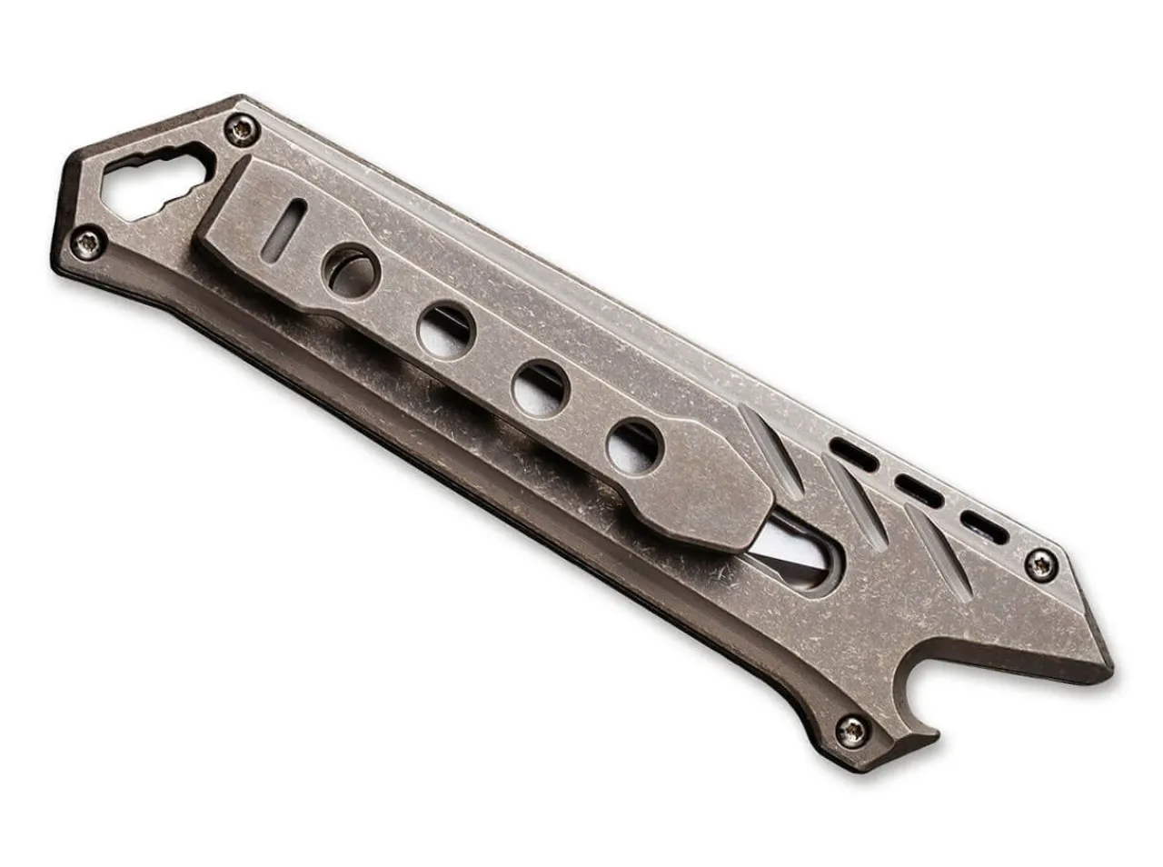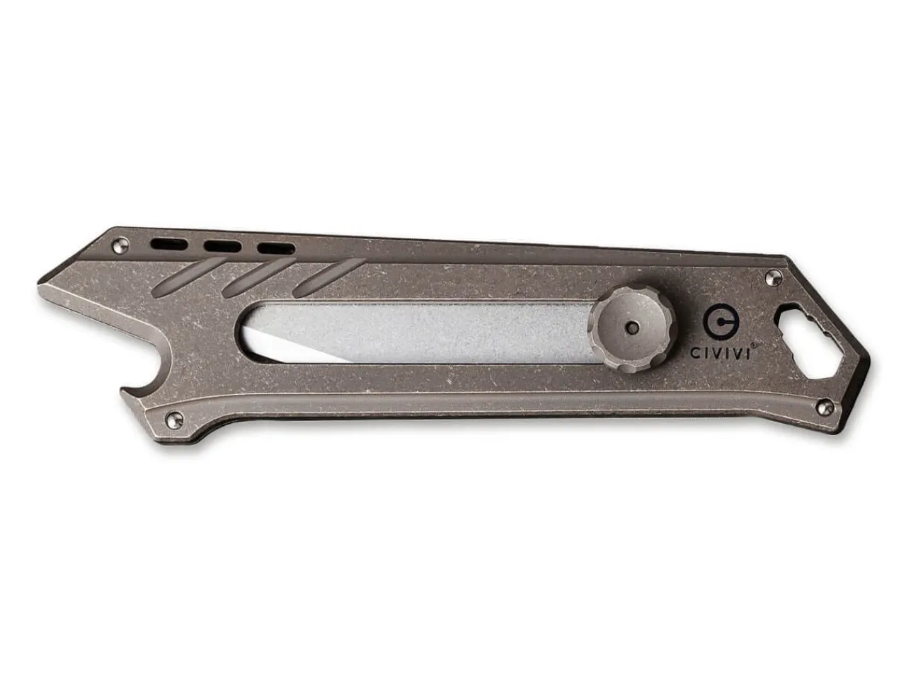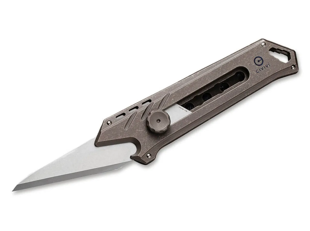 The Civivi Mandate Is A Compact Knife With An Extendable And Replaceable Blade. The Bronze-Colored Handle Is Made Of Milled Titanium, And Has An Easy, One-Hand Action. When Closed, The Handy Pocket Knife Can Also Be Used As A Bottle Opener. The Lanyard Hole Also Functions As A Practical Bit Holder, Which Is Compatible With Different Sizes. The Knife Comes With Two 9Cr18Mov Blades And One Damascus Steel Blade. With Clip (Tip-Down).