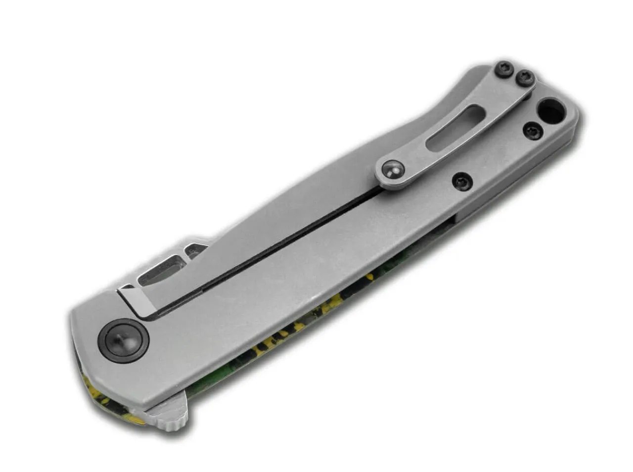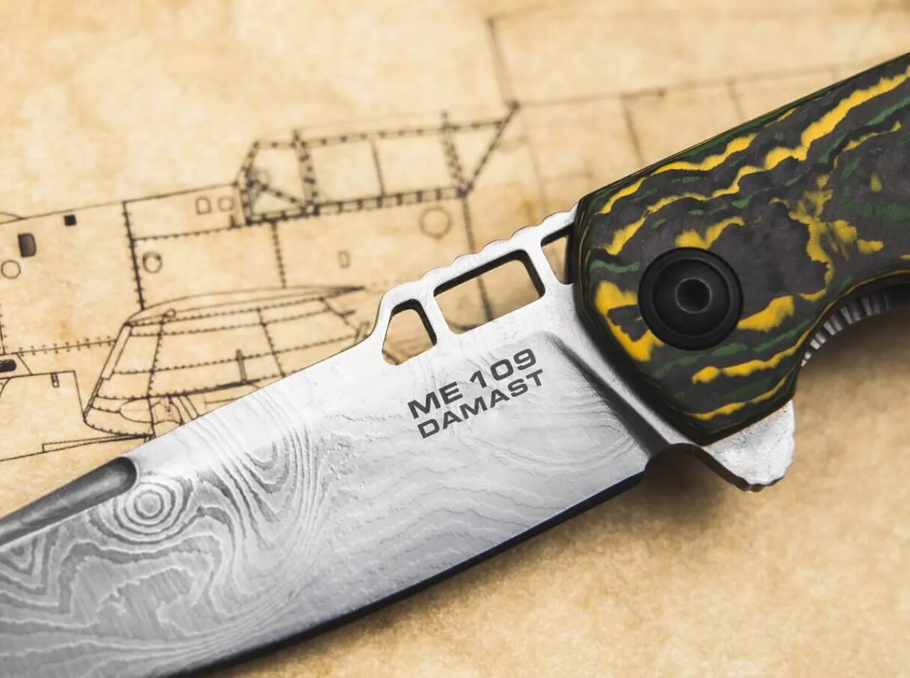 The Boker Plus Me 109 Damascus Picks Up Numerous Design Elements Of The Legendary Messerschmitt. The Opening At The Back Of The Blade Base Has The Unmistakable Shape Of The Pilot’S Cockpit And Is Visible When The Knife Is Closed And Open. The Folds In The Sheet Metal Of The Engine Cowling As Recesses For The Barrel Soul Axles Of The Two Mg 17S Form The Template For The Schor At The Tip Of The Blade. The Flipper Indicates A Wheel Of The Retractable Landing Gear. For The Front Carbon Fibre Shell, The Material Toxic Storm From The Manufacturer Fatcarbon Materials Was Chosen In The Colours Green, Black And Yellow. The Colour Scheme Is Based On The Characteristic Camouflage Paint Of The Bf 109 With Greenish-Grey Undercoat And Yellow Front Fuselage. The Opposite Side Has A Titanium Framelock With An Elaborately Integrated Carbide Contact Surface. A Beautifully Designed And Elaborately Integrated Clip Allows The Boker Plus Me 109 To Be Worn Tip-Up On The Right. Supplied With A High-Quality Case For Storage And A Certificate Of Authenticity.