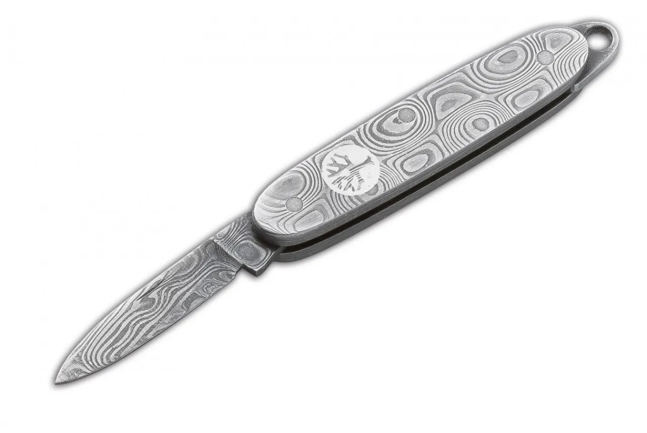 Damascus Meets Bonsai! Just Like The Famous Japanese Miniature Trees That Grow Into Small Works Of Art After Years Of Elaborate And Meticulous Care, Our Mini Damascus Is A Strongly Reduced, But Yet Entirely Original And Artful Miniature Version Of A Damascus Pocket Knife. Blade And Tang Are Entirely Made Of Stainless Damascus, So The Term “Jewel” Can Be Taken Literally. The Folder With A Thickness Of 5.6 Mm, It Can Even Be Carried As A Necklace.