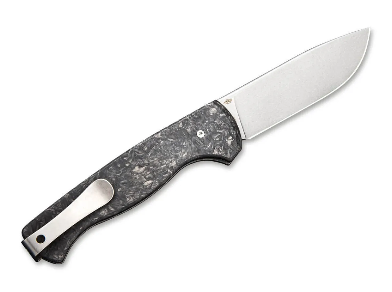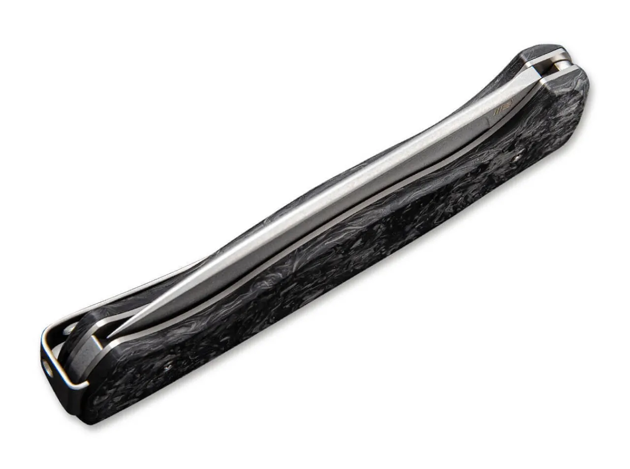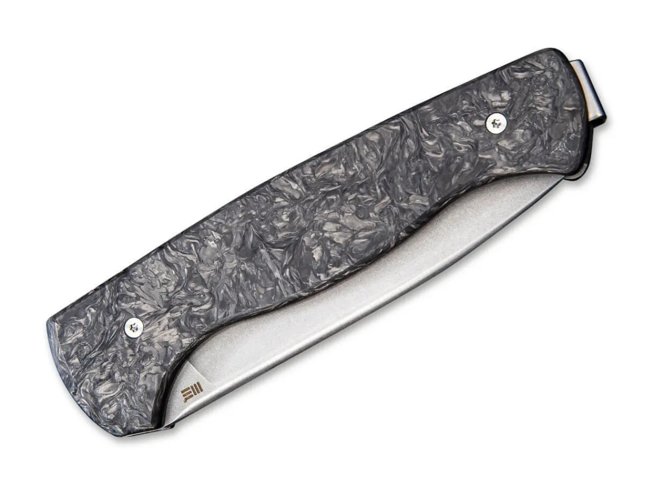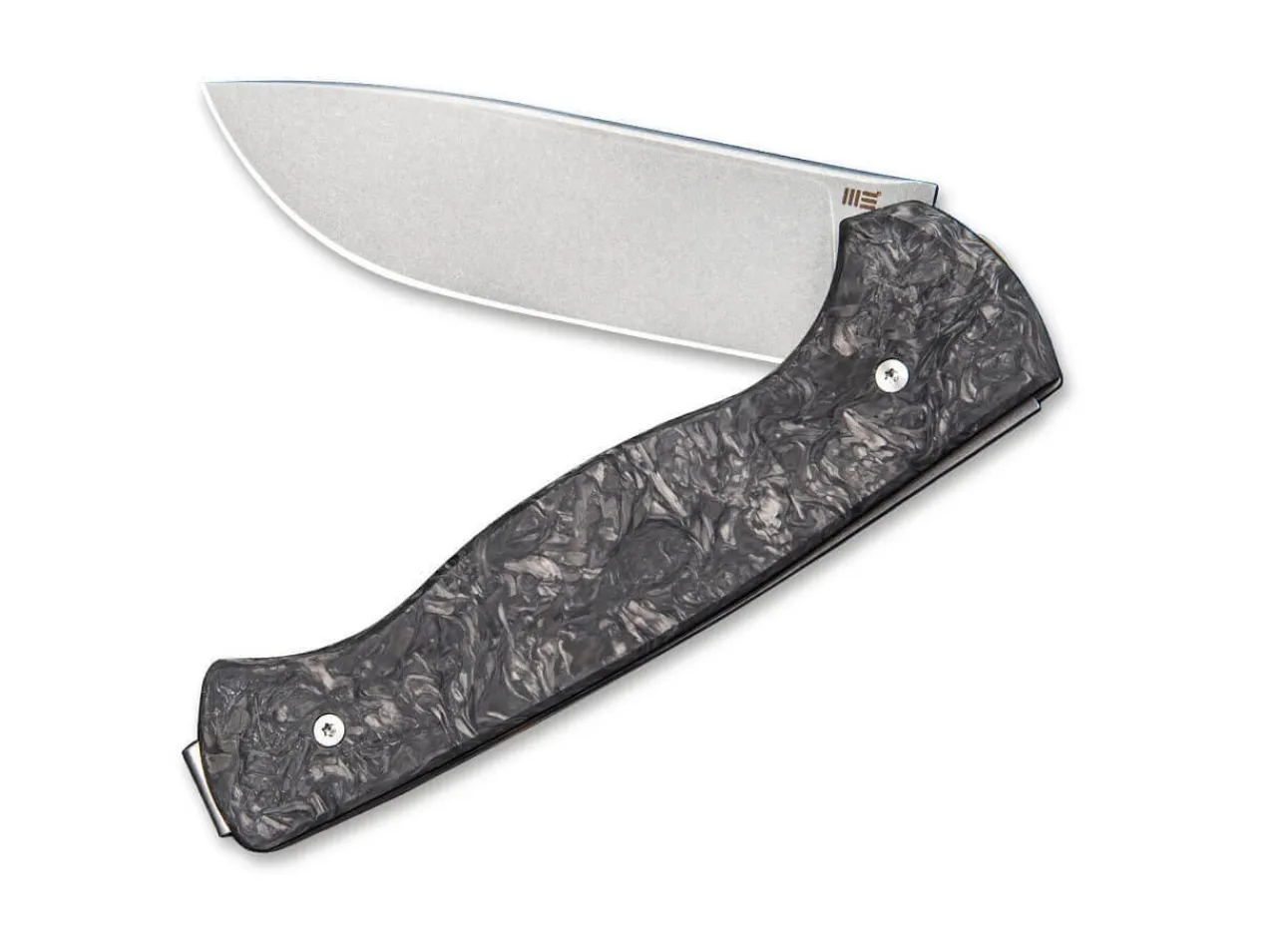 Das Feine Slipjoint-Messer Mrf Von We Knife Entstand In Zusammenarbeit Mit Messermacher Markus Reichart, Der Vor Allem Fur Feststehende Messer Bekannt Ist. Dieses Messer Ist Mit Einer Breiten Droppoint-Klinge Aus Cpm-S-35Vn Ausgestattet. Die Stonewashed Klinge Ist Mit Einem Grosen Griff Aus Schwarzer Marmorierter Kohlefaser Gepaart, Die Das Gewicht Reduziert Und Dem Messer Eine Schone Asthetik Verleiht. Fangriemenose Und Clip (Tip-Up) Sorgen Dafur, Dass Das Messer Immer Griffbereit Ist.