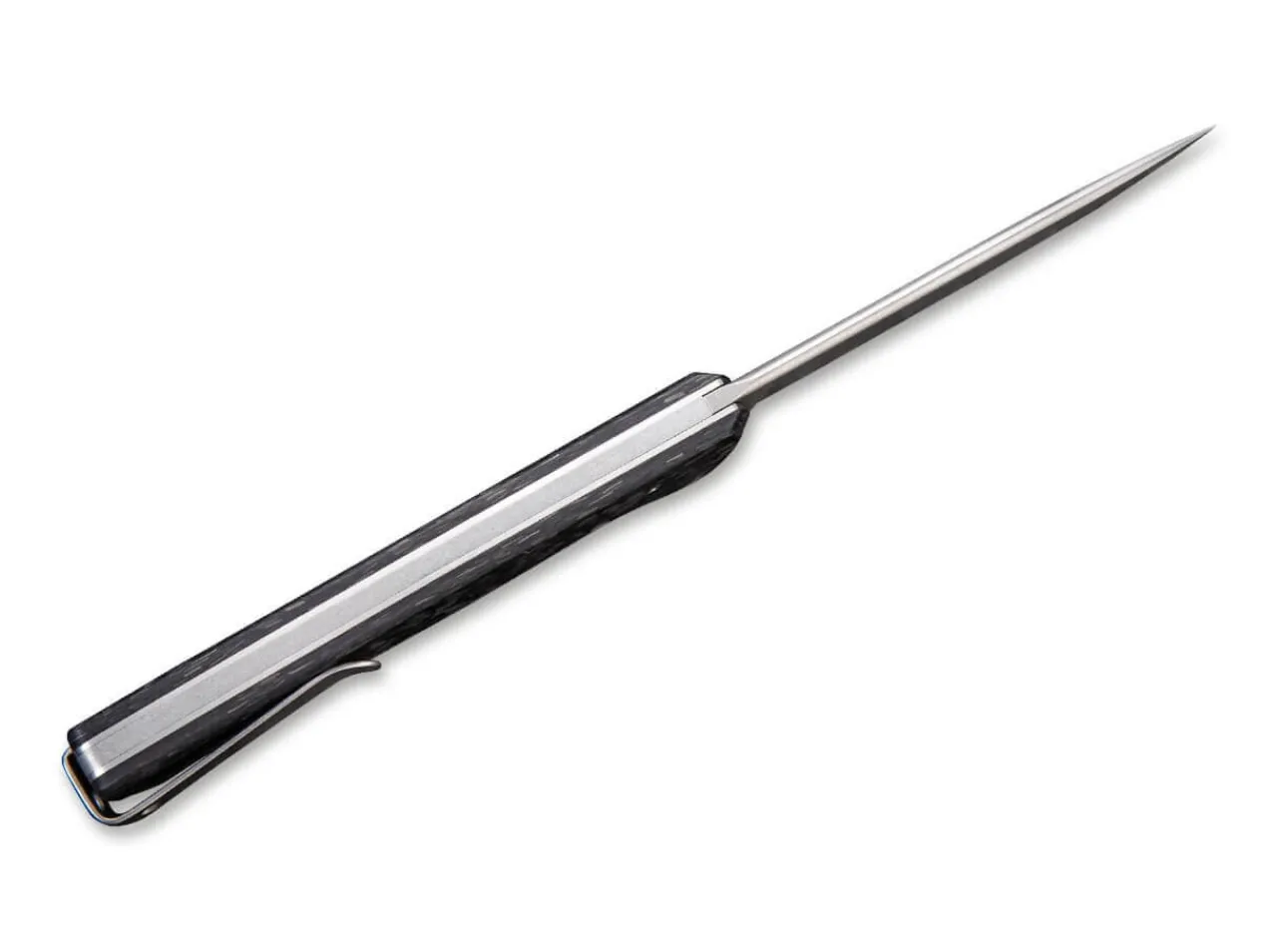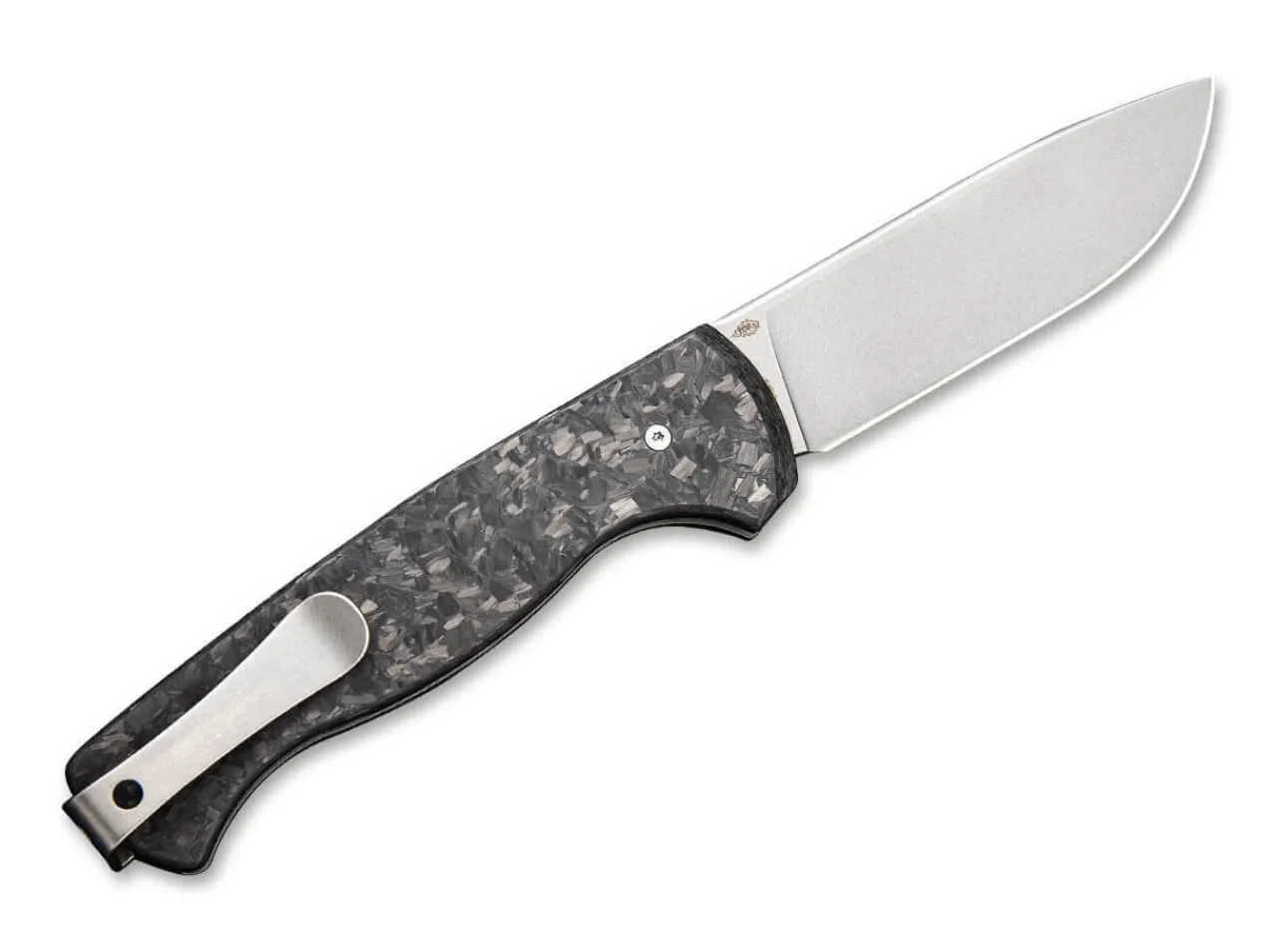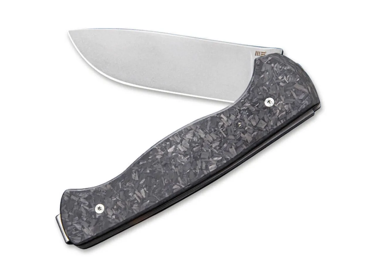 Das Feine Slipjoint-Messer Mrf Von We Knife Entstand In Zusammenarbeit Mit Messermacher Markus Reichart, Der Vor Allem Fur Feststehende Messer Bekannt Ist. Dieses Messer Ist Mit Einer Breiten Droppoint-Klinge Aus Cpm-S-35Vn Ausgestattet. Die Stonewashed Klinge Ist Mit Einem Grosen Griff Aus Schwarzer Geschredderter Kohlefaser Gepaart, Die Das Gewicht Reduziert Und Dem Messer Eine Schone Asthetik Verleiht. Fangriemenose Und Clip (Tip-Up) Sorgen Dafur, Dass Das Messer Immer Griffbereit Ist.