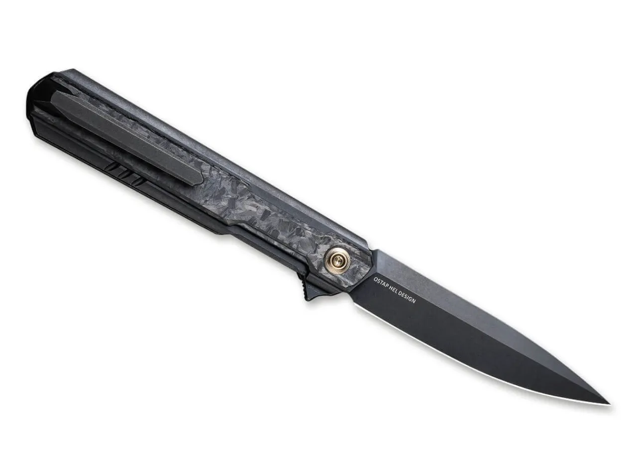 Die Geradlinigkeit, Mit Der Ostap Hel Seine Messer Entwirft, Findet Im We Knife Peer Ihre Perfekte Umsetzung. Der Schlanke Folder Bekennt Sich Zu Seinen Markanten Zugen Und Bildet Optisch Einen Guss Aus Der Pulvermetallurgischen Cpm-20Cv Klinge Und Dem Mit Kohlefaserschalen Besetztem Titangriff In Edlem Schwarz. Flipper Und Linerlock Fugen Sich Formschon In Die Linienfuhrung Des Messers Und Werden Durch Den Kantigen Clip (Tip-Up/R) Formschon Untermalt.