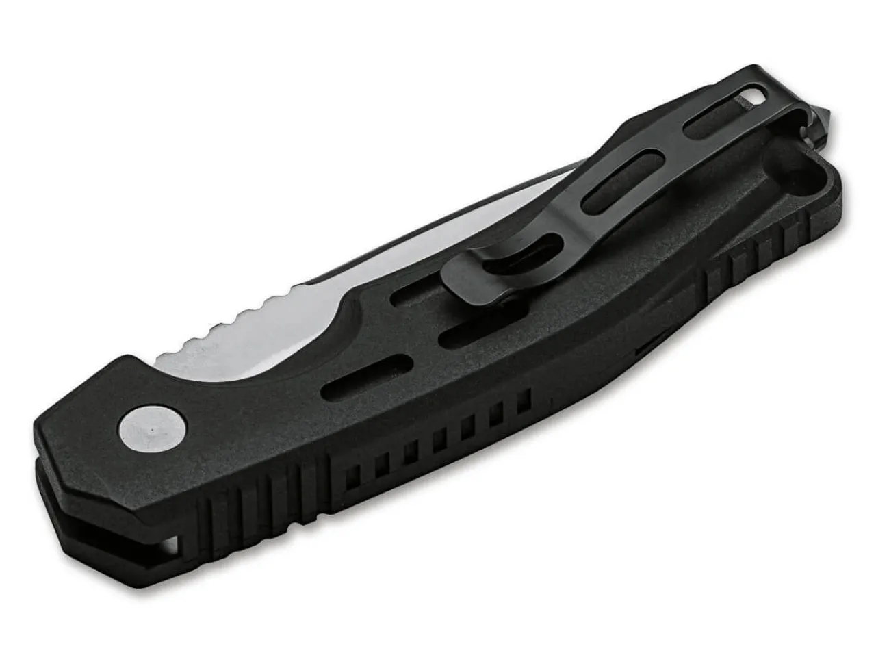 The Boker Plus Thunder Storm Auto Designed By Boris Manasherov Is A Rugged Tactical Knife. Its Pronounced Finger Choil Makes It Very Handy In Any Grip Position. Fast Position Changes To A Reverse Grip Or Vice Versa Are Supported By The Ridges In The Blade Spine And Handle. The Black Handle Scales Are Milled From Aluminum With Weight-Reducing Jimpings. The Aus-8 Blade Has A Light Stonewash Finish And Opens Automatically With A Push Button. With A Tungsten Carbide Glass Breaker, Lanyard Hole And Repositionable Deep-Carry Clip (Tip-Up).