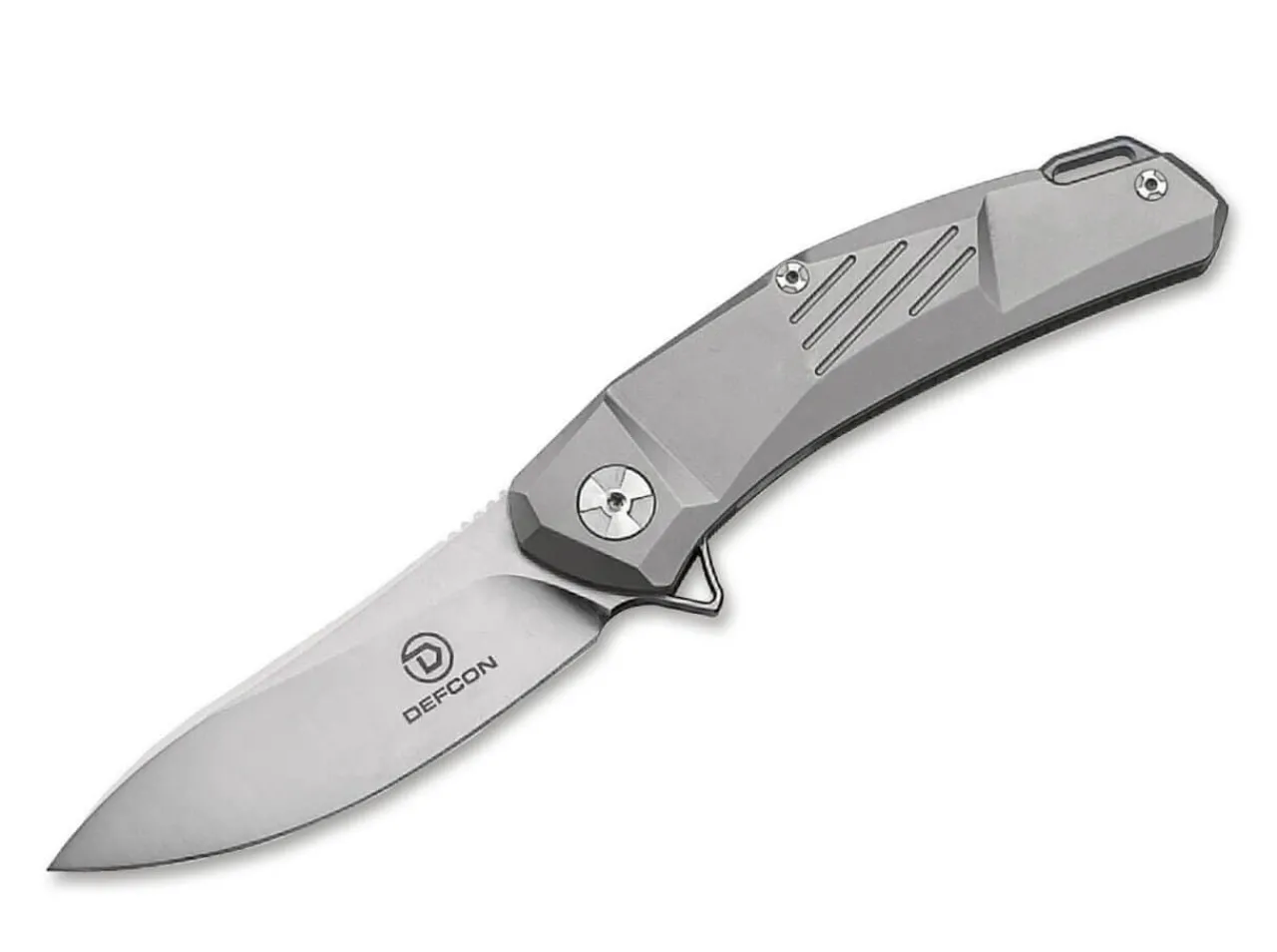 Das Defcon Ulu Erscheint Im Stilvollen Design. Die Leicht Nach Oben Geschwungene Droppoint-Klinge Harmoniert Mit Der Gegensatzlichen Krummung Des Griffs Und Gibt Dem Gesamtprofil Des Messers Eine „S-Form”. Die Satinierte Klinge Ist Aus Verschleisfestem D2 Stahl Gefertigt Und Wird Per Flipper Reibungslos Geoffnet. Die Detaillierungen Des Griffs Verleihen Dem Messer Ein Fast Zerkluftetes, Eckiges Aussehen, Das Ansprechend Aussieht Und Sich Gut Anfuhlt. Er Ist Aus Eloxiertem Titan Gefertigt Und Verfugt Uber Eine Fangriemenose. Mit Deep-Carry-Clip (Tip-Up).