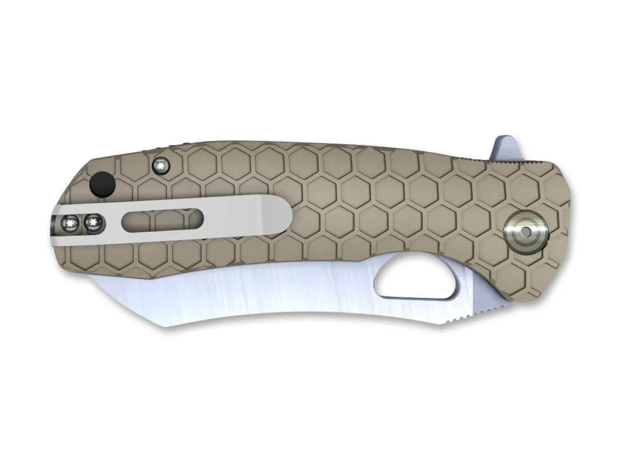 What Is Particularly Impressive About The Honey Badger Wharncleaver Large Is Its Durable Construction. The 8Cr13Mov Wharncliffe Blade Is Extremely Robust And Easy To Sharpen. The Thick Shaft And Wide Profile With Full Flat Grind Provides Stability And Makes Cutting Easy. The High-Quality Ball Bearing Pivot Enables Smooth Opening And Closing Of The Satin-Finish Blade, Either With The Flipper Or Thumb Opening. The Honeycomb Pattern On The Textured, Tan Frn Handle Scales Ensures A Secure Grip. With Lanyard Hole And Reversible Deep-Carry Clip (Tip-Up/L-R).