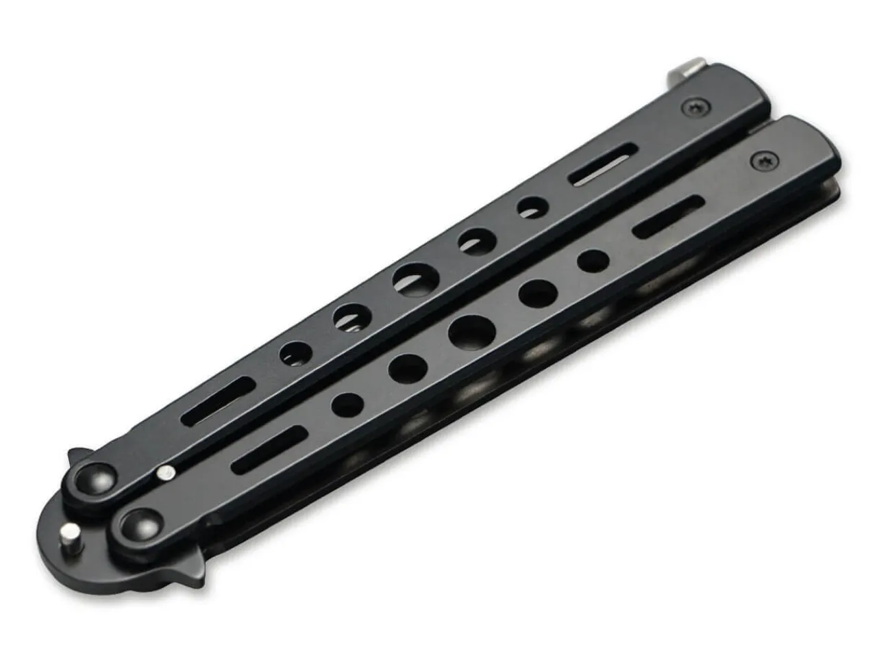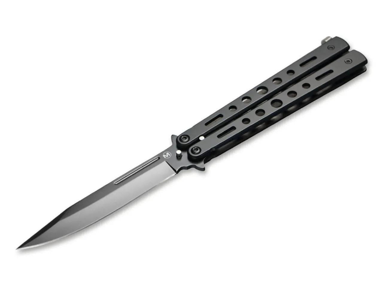 The Magnum Balisong All Black Consists Of Two Handle Scales, Which Can Be Swiveled 180 Degrees. Between These Two Handles The Blade Sits, It Is Attached With An Axle Pin. The Handles, Like The Blade, Are In A Tactical Matte Gray. This Knife Is A Lightweight And Multi-Purpose Companion With A Wide Range Of Applications In Everyday Life.