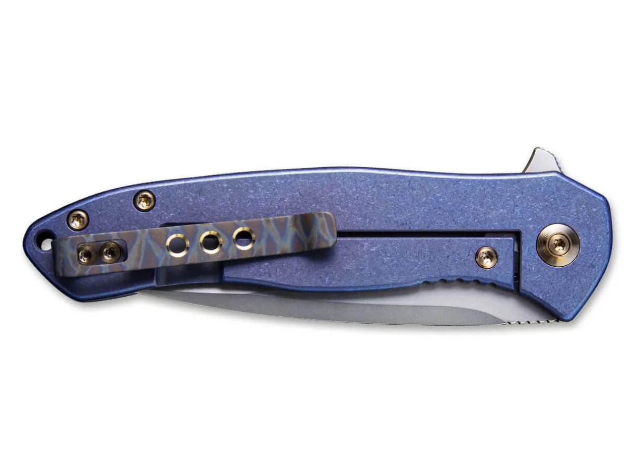 The We Knife Kitefin Is A Medium-Sized, All-Purpose Edc Knife With A Wide Droppoint Blade Made Of S35Vn That Accommodates A Generous Finger Recess For Detailed Cuts. The Flipper Ensures Smooth Opening Of The Ball-Bearing Blade And Also Serves As A Finger Guard. A Solid Framelock Holds The Blade Firmly In Place For Safe Working. The Kitefin Knife Series Is Available In Different Handle Colours And Styles. This Version Is Equipped With Beautifully Shaped Blue Titanium Handle Scales. A Centrally Milled Gold-Coloured Groove And Gold-Coloured Screws Add Unusual Colour Accents. With A Lanyard Hole And A Convertible Deep-Carry Clip (Tip-Up).