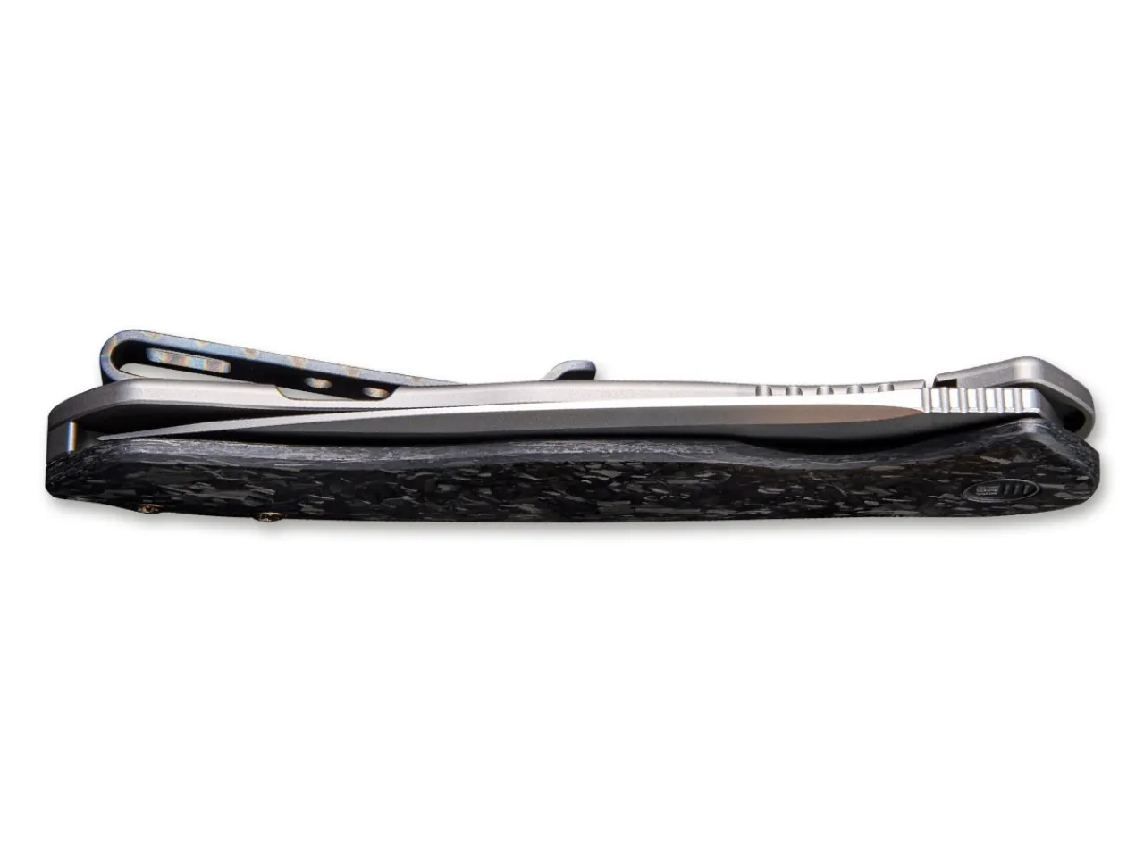 The We Knife Kitefin Is A Medium-Size, Universal Edc Knife With A Wide, Drop Point S35Vn Blade Featuring A Generous Finger Choil For Detailed Cutting. The Flipper Ensures Smooth Opening Of The Ball Bearing Mounted Blade And Also Serves As A Finger Guard. A Sturdy Framelock Locks The Blade Firmly In Position Allowing Safe Handling. The Kitefin Knife Series Is Available In Different Colored Handles And Styles. This Version Features Stylish Gray Titanium Handle Scales On The Back And Shredded Carbon Fiber On The Front. With Lanyard Hole And Reversible Deep-Carry Clip (Tip-Up).