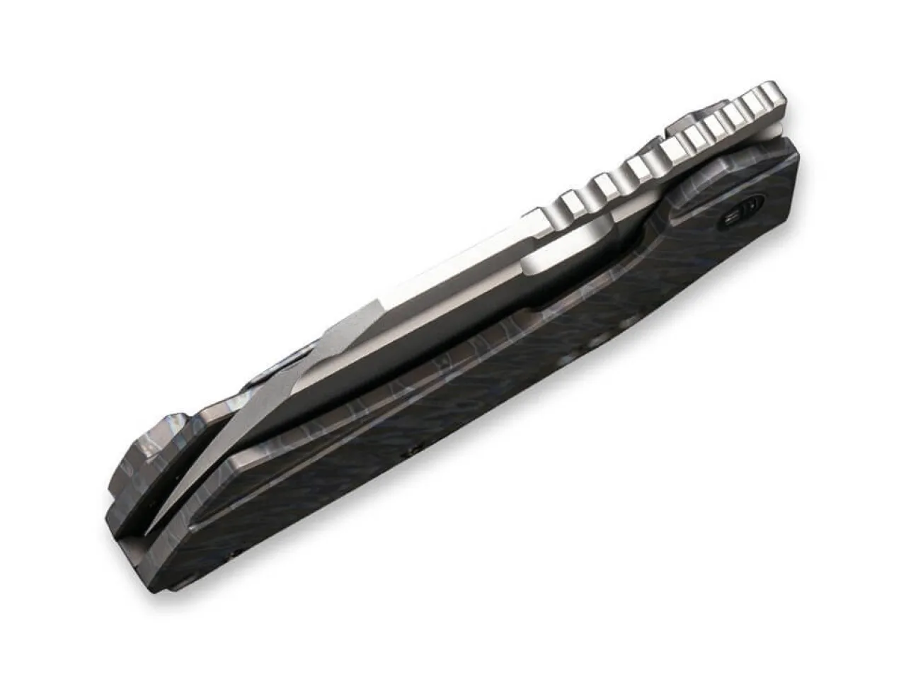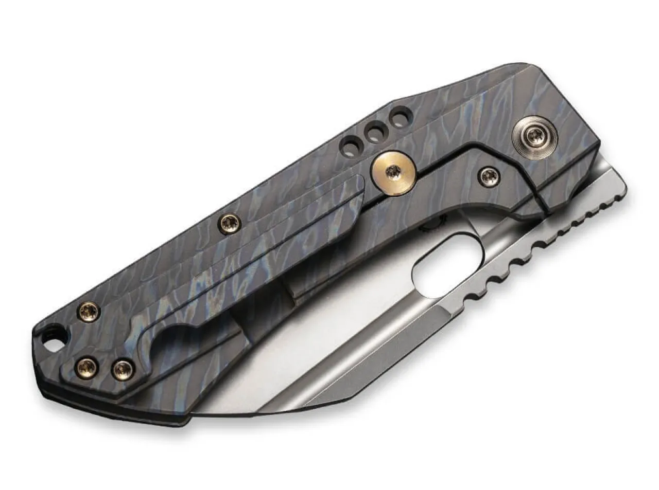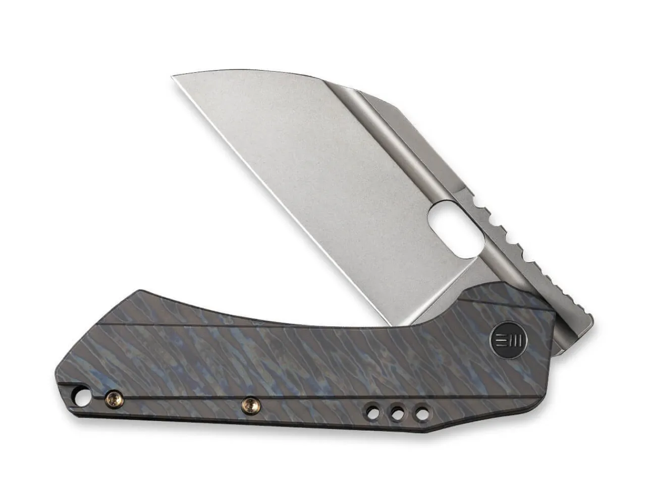 Das Rustikale We Knife Roxi Lasst Keine Zweifel Offen Und Punktet Mit Einer Sheepfoot-Klinge Aus Pulvermetallurgischem Cpm-S-35Vn Und Einem Edlen Titangriff In Tigerstreifen-Optik. Der Alltagstaugliche Framelock Folder Offnet Per Daumenoffnung Und Ist Mit Einigen Zierelementen Wie Einer Hohlkehle Sowie Gewichtssparenden Lochern Im Griff Versehen. Mit Fanrgiemenose Und Clip (Tip-Up/R).